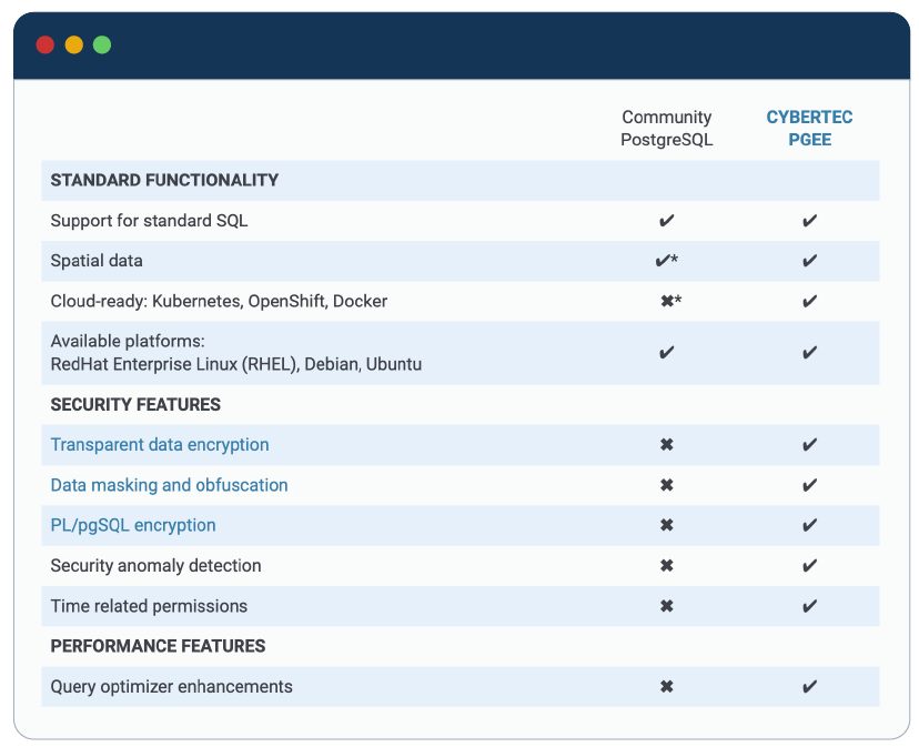 When your compliance needs to go beyond standard PostgreSQL, choose CYBERTEC PostgreSQL Enterprise Edition with TDE and many other benefits.